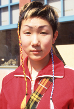 カラーリングは4 ヵ月前から自分で金色と赤色を入れました。その後、美容院で伸びた髪をカットしてもらっているので、ブロックにしました。後ろにつけ毛は美容師につけてもらいました。右側は、ラフォーレの店でつけ毛を買って自分で案でそのまま接着剤でとめています。髪の毛洗うときもそのまま。