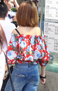 花柄の赤いオフショルダートップスとデニムのコーディネート。赤...