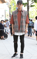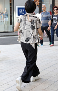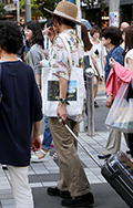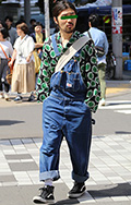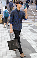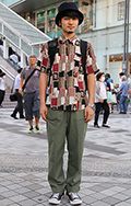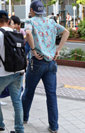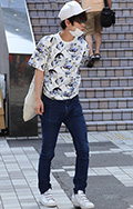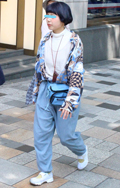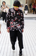 シャツとパンツ、スニーカーと全て異なる柄で統一した男性。この...