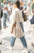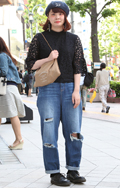 レーストップス+デニムパンツがヘルシーな印象の彼女。店頭でも...
