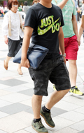 迷彩Tシャツにスウェットパンツ、スポーティなトングサンダルで...