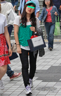 キャップとキャミのグリーンが爽やかな印象の彼女。ハートや反対...