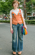 マルチボーダートップスにデニムビスチェを重ね着。ノームコアと...