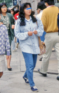 トップスがクルーパンツの上に出ているもの。ここではジーンズやスラックス以外で折り目が付いていないストレートパンツをクルーパンツと定義。