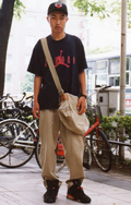 上記のボトムに、くるぶしにかかる長さまでの靴を合わせているスタイル。靴の素材、形、色は何でも可。