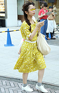 鮮やかなレモン色のモザイク柄ワンピース。サイドの三つ編みやラ...