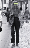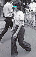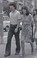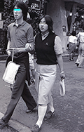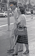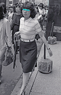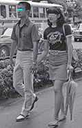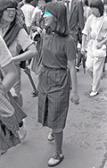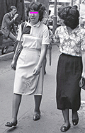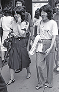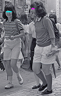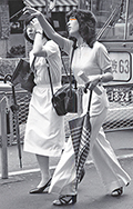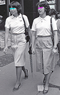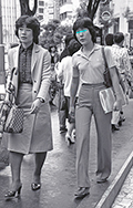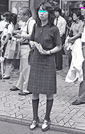襟がついたニット製のプルオーバー型の半袖シャツを着用する女性すべて。色は問わない。