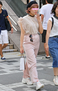 ヘアカラーから足元までピンクベージュ系のワントーンコーディネ...