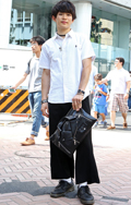ビッグサイズ気味の白シャツに安定の黒の太めタックパンツ。リン...