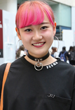 ファッションは自分流で、ジャンルもいろいろ変わります。今日は黒だけれど、普段はカラフルで全然黒は着ません。全身古着とかのときもよくあります。個性的で誰も着ない服を着たい。今日は気分的に黒を着ました。