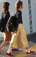 ベージュのチノ素材スカートや赤茶色のスニーカーなどにベレー帽...