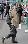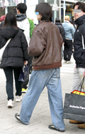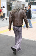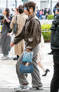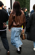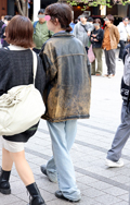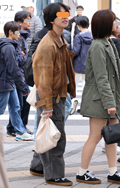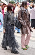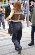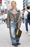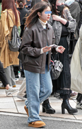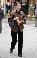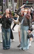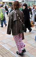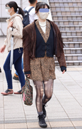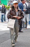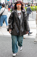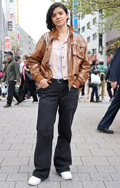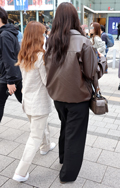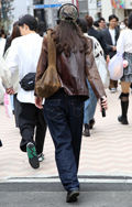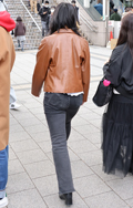 茶レザージャケットは女性の着用がほとんどだった原宿地点。黒を...