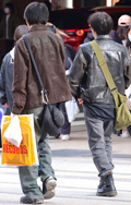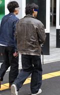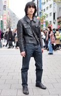レザージャケットの3人組。原宿ではレザージャケットに色落ちデ...