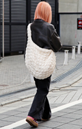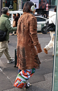 ヘアカラーとアウターの色がリンクしていた女性。赤みのある茶色...