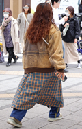 明るい茶系のレザージャケットにパステルカラーのチェック柄パン...