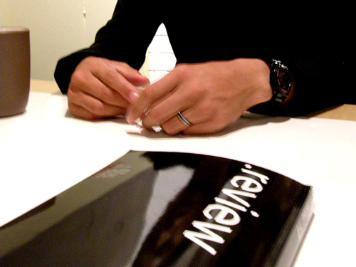 大学院生や、物を書きたいと思っている人、メディア作りに関心がある人を中心に、幅広い人たちに買っていただいているようです。1号にあたる『.revierw 001(ドットレビュー)』は合計800部刷りました。最初500部作ったのですがあっという間に足りなくなって、追加で300部刷りました。『.review 001』のときには、ノウハウがなくて300ページ超にもかかわらず、実質10日くらいで作りました。最初は誤字脱字、誤植も多かったのが本当のところです。増刷した300部はそれらを直して、コンテンツを追加しています。それを『.review 001』ver1.3として、今書店や大学生協さんで販売していただいています。それだけではなく、直販や一部のコンテンツは電子書籍化してダウンロード販売も行っています(dotreview.jp/premium/)。今思えば最初のものは0.9くらいでしたね。それを買っていただいたのですからありがたいと思うのと同時に、関心を持っていただくことができたと思っています。