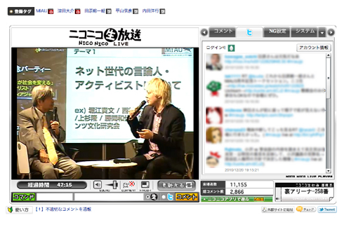 2010年12月20日のMIAU(インターネットユーザー協会)3周年記念パーティで行われた田原総一郎さん(ジャーナリスト)との対談を、ニコニコ生放送でネット配信。2010年には『クローズアップ現代』(NHK)、『フジテレビ時評』(フジテレビ系)など、津田さんは地上波にも登場している。
