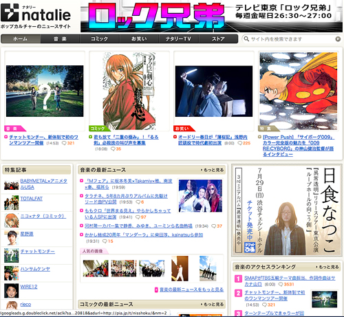 社長のサポートができる有能なスタッフがほしいので、僕の友人だった荒木源という編集者に声をかけたんですが、最初は「ナタリー? ないよね!」と言われて5分で終了(笑)。でもその3ヶ月後くらいにいきなり彼から電話があって「コミックナタリーはイケると思うんだよね」と。彼は某ファッション誌の編集部にいたんですが、元々サブカル人間だったので、ちょうどその頃ファッションのきらびやかな世界に嫌気がさしていたみたいで意気投合。彼が「コミックナタリー」の編集長になり、今は音楽と並ぶくらいのPVがあるコンテンツになっています。
