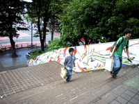 絵の方は、2003年の10月末からずっと、壁の清掃を10人ぐらいでやってました。週1-2回、消して、消して消しまくった。本当は描きたいんだけど、今日も消してきました、って渋谷区に伝え続けたんです。壁を清掃し始めて5ヶ月ぐらいですかね、区のほうでもさすがに1回描いてみなよ、という話になった。それが、リーガルウォールのはじまりです。04年3月のことです。
