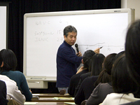 参加者は、35 名、男女比は4:6と女性が多い。学生が中心だが、4割ほどは社会人で、仕事帰りと思われるスーツ姿の男女も見られた。なかには愛媛や愛知など遠方からの参加者も。講義中、参加者は熱心にメモを取り、終始真剣な雰囲気。質疑応答では「年齢は採用に関係あるのか」「資金繰りはどうしているのか」「男性は採用に不利なのか」などの質問が飛び交い、関心の高さが伺えた。