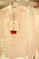 シャツのベースとなる形は2パターン。08A/Wシーズンは全25型、サイズは3サイズで展開。生地や袖口、襟元などのディテールや微妙なシルエットなど、細部にこだわることで、それぞれ異なる表情を生み出している。特にシルエットは、生地によってパターンを変え品の生まれるタイトフィットに仕上げているのだそうだ。今シーズンは白をメインに、メンズにはあまり見られないシャーリングやボリュームのあるフリルを施した存在感のあるシャツを揃えるほか、襟や胸ポケットにグラフィカルプリントを施し、カジュアルに取り入れられるシャツも展開。価格帯は、10,000円台〜90,000円台(!)と幅広いが、中心価格帯は20,000円台だという。
