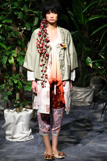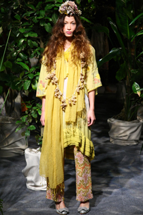 白、ベージュ、茶、黒を基調に、黄、ゴールド、朱を差し色としてミックス。同ブランドが得意とするワンピースやワイドパンツ、ロングコートなど、ゆったりとしたシルエットのアイテムを組み合わせたレイヤードスタイルを発表した。素材はコットンガーゼやリネンなどのナチュラルな風合いのものが中心。フリルやレースなどのハンドクラフト感のあるディテールを盛り込み、花柄やグラデーションを多用。さらに足もとにスウェードモカシンを合わせるなど、ちょっぴりフォークロアテイストを感じさせるスタイルが目立った。