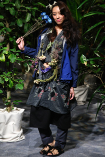 「fur fur」(ファーファー)として3回目となる今回のコレクションは、アコースティックギターやバイオリン、ハープの生演奏に合わせて、木々の間をモデルが行き交う演出でスタート。モデルたちはドライフラワーで作られた花輪や首飾りを身に付け、フェミニンでロマンティックな世界観を表現した。