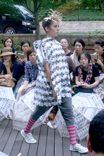 モチーフになっているのは、恐竜の骨や細胞のような柄や、英字紙のフォトプリントをコラージュ、前回のコレクションでも多用されていたジグザグ模様などで、ミントデザインズのトレードマークである女の子の連続モチーフが重なり、近未来的な幾何学レース柄の印象も。ミントデザインズらしいギンガムチェック柄をはじめ、色の異なる柄のトップスに柄のボトムスに柄のソックスという高度なレイヤードは、一体成型の白いレインブーツがハズしのコーディネートに一役かっていた。