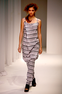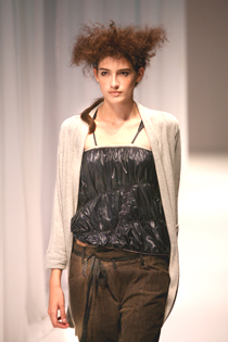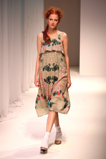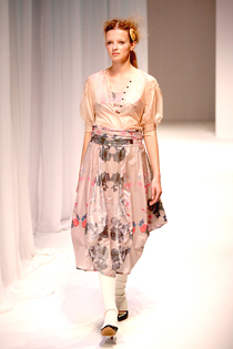 アンビエント系の音楽を背景に、ベージュのキュプラシフォンに折り紙柄のインクジェットプリントのワンピース、スモーキーグリーンのセルロースとシルク、ナイロン混紡のコンビネーション、襖用の紙によるジャケット+綿麻キャンバスに手工捺染(なっせん)によるパンツなど、ダスティでマットな質感が際だつミニマムで都会的な作品が新鮮だった。