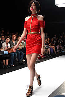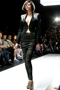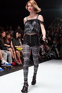 レギンスやドレスにはアフリカのタトゥトライバルをモチーフにしたプリミティブな柄を起用。また、鳩目がたくさん付いたレースアップのミニスカートや、腰から裾までジップが付いたパンツ、肩にゴールドのスタッズが付いたジャケットなど、メタルパーツを多用しているのも特徴である。