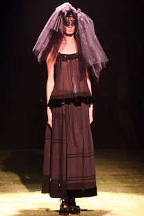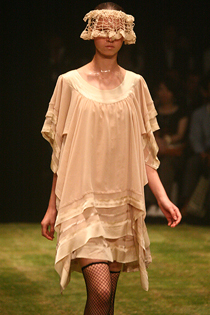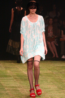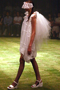 1995年春夏のデビュー以来、東京コレクションのベテランブランド、sunaokuwahara(スナオクワハラ)。円形に芝生が敷きつめられた真っ暗な会場に、虫の鳴き声が響き、夏の一夜に月明かりのような月光が差し込める中、黒いドレスをまとった妖精が静かに踊りだす。モデルたちは目をレースで覆い、厳かでミステリアスな雰囲気だ。