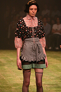 中盤ではチロリアンテープや、ドットやフラワープリントなどアンティーク調のテキスタイルを組み合わせたレイヤードスタイルが登場。小さな女の子がお母さんの洋服をいたずらして重ね着しているような、ちょっぴり牧歌的な印象だ。