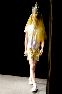 続いて、イエローのベールにレインボウ・ストライプのカボチャパンツやゴールドのパンツを身に付けた男の子がかわいいチークで登場。ディテールは丁寧で繊細な仕上げになっているのに、頭にはヒマワリの冠が被せられ、どこかおバカな雰囲気に。織りでドット柄を表現したり、レインボウ・ストライプは多用されており、ピンタックがあしらわれたマオカラーのシャツとセットアップ(もしくはつなぎ?)は、キッチュなお姫様のパジャマルックといった雰囲気になっていた。