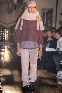 同ブランドの09/10AWコレクションが自由学園明日館を会場に行われた。フランク・ロイド・ライトが設計を手がけ、重要文化財に指定されている歴史的な建物を活かし、木漏れ日のようなライティング、ステンドグラスから光が差し込み、木々のざわめきや子供の声が流れる、ファンタジックな演出となっていた。