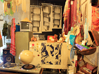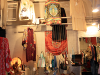 クセがある商品を手に取ってもらうには、モチベーションが高いお客さんに来てもらうことが不可欠と考え、あえてふらりと入りにくい地下の物件を選んだ。内装は、配管がむき出しの天井や、手塗りの凹凸のある内壁、少しペンキが剥がれかかった床など、どこか退廃的な雰囲気。全ての商品がまんべんなく見られるよう、すべての商品を畳まずに天井から吊るしてディスプレイしている。