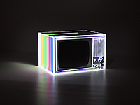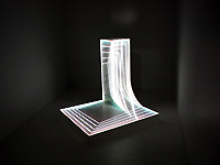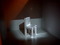 代表作品であり、今回も展示している、イスの輪郭をなぞるように、レーザーのような光線が面の端を動き、そして輪郭を結ぶ角で合流、平行移動する作品「chair(チェア)」では、視覚効果が、イスの存在自体を透明化する奇妙な感覚に捉えられる。他にも、テレビや奇妙な立方体などを使い、面それぞれが独自のアニメーションで構成されながら、音楽とともに不思議な存在感のリズムを生み出している。