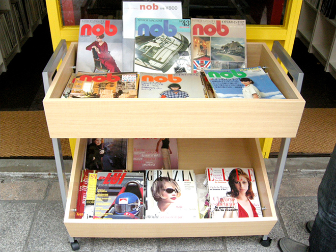 古書店といえば定番の店頭ワゴンセール。この日は70年代のインテリア雑誌『nob』や仏版『ELLE』など掘り出しものに出会える?!