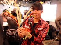 また今回、「あなたの考えるスーパーデラックスなものを身につけて来て下さい」というドレスコードが設けられており、ワークショップ部の3人はネクタイをモチーフとしたおそろいの衣裳を着用。安斎さんと舘野さんは捲き方を変えたネクタイ、牧村さんはネクタイで作られたベストを着ていたが、この衣裳には、フォーマルなものをカジュアルに遊びたいという思いが込められているそうだ。会場では、アラレちゃんの帽子や羽織、着物、m-floをイメージしたコーディネートなど思い思いの衣裳を身につけた参加者の姿がみられ、和やかな雰囲気が会場全体に溢れていた。