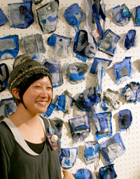 VACANTCircles in Blue展では、同じく“青”を『here and there』誌面とは違った形で視覚化。テキスタイルなどの素材でアートブックを制作し、根強いファンを持つ山田愛子さんといったベテランの作家を筆頭に、伊藤さちさん、川瀬ルアさん、中島紗江さん、メルセデス・ヴィシャルバさん/ mejunje(メフンヘ)といった新鋭のアーティスト5人が、布のインスタレーションやアートブックを制作した。
