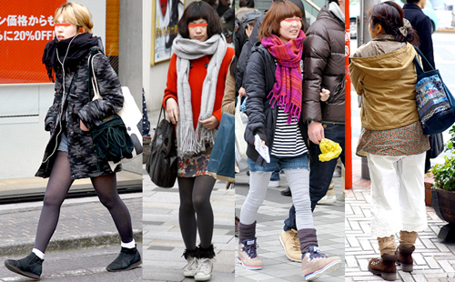 2011年最初の定点観測。もっとも流行っているスタイルということで注目したのは、「女性ミニ丈ボトムス、うち+ショートブーツ」だ。