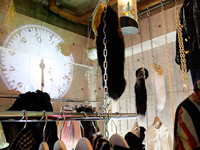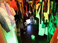 出店場所に渋谷を選んだのは、高円寺や原宿などいろいろなエリアを訪れた中で、最も「東京」を感じた場所だから。とにかくたくさんの人がいて、そのなかにギャルやビジネスマン、OLなどの幅広い層がいること、大阪にはないスクランブル交差点に衝撃を受けたそうだ。物件は、せまくて隠れ家のようなものを探した。大阪の「WAGADO(我が道)」が地獄をイメージに、「GENECON(ジェネコン)」が天国をイメージの内装であることから、同店はその2つを合わせた明暗を感じられる内装にしたそうだ。広さは約40平米。ブラックライトが光る店内には、天井から洋服が吊るされておりまるで迷路のような空間になっている。昭和を思わせるレトロな看板があったり、マネキンがぶら下げられていたり、独特の世界観に浸れる。