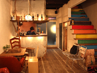 「toco.」が 入居する物件は、以前眼鏡屋さんだった築40年の建物と、大正時代に建てられたという古民家。入口のガラス張りの引戸越しに見える虹色の階段に目をやりな がら、年月を重ねた温もりのある木造の建物に一歩足を踏み入れると、リビングとレセプション兼バーカウンターがあり、スタッフや客が談笑する姿が目に入 る。その様子はまるでカフェやバーのようだ。奥にすすみ、リビング奥の引戸をあけると、2階建の宿棟へ。緑あふれる庭を横目に縁側を通ると、ドミト リー(相部屋)や和室、パソコンコーナーがあり、さらに手作りのキッチン、ダイニング、シャワー、トイレなどの共有スペースとなっている。自炊が基本とな り、宿泊はドミトリー1泊2,600円〜。