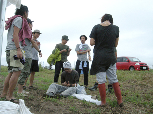 大型台風 が西日本に上陸、全国的に不安定な天候の中、東北コットンプロジェクトの交流会「荒浜ワタの花見会」が行われた。当日は、午前中に綿畑の草取り、午後に 花見を兼ねた懇親会、というスケジュール。仙台空港や駅からバスでの送迎も用意するということから大きなイベントだとは思っていたが、現地の賑わいは予想 以上だった。