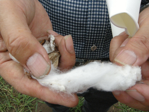無農薬で育つ綿畑は雑草も多く、虫もついているように見えたが、「虫は、無視すればいい」と明言。葉に虫がついても、種を守る部分のコットンには影響がなく、収穫も手で摘むなら枯れ葉剤も必要ないという。この地からオーガニックコットンができることは間違いないようである。