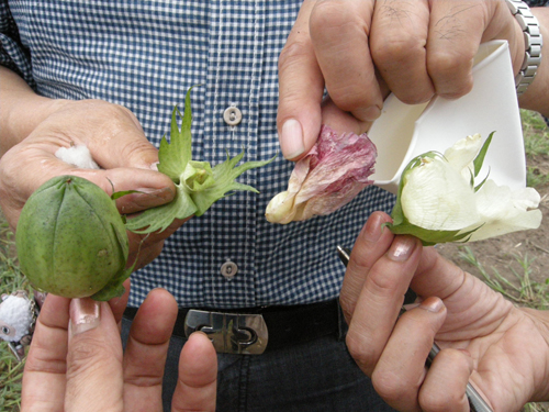 (写真右から左へ)綿花は最初白く、後にピンク色になり、花弁が落ちた後の中の小さな軸が育ち、コットンボールになるのだそう。