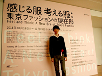 ファッションの展覧会というとマネキンに着せた服が整然と並ぶ、といったスタイルのものが多いけれど、2011年12月25日まで東京オペラシティアートギャラリーで開催中の「感じる服 考える服:東京ファッションの現在形」は少し変わっている。目の高さに架け渡された白い梁で空間がゆるやかに区切られていて、その中に服が展示されているのだ。といっても小屋や、巨大な動物のオブジェや、映像で会場が埋め尽くされていて、本当にファッション展?と思える勢いだ。