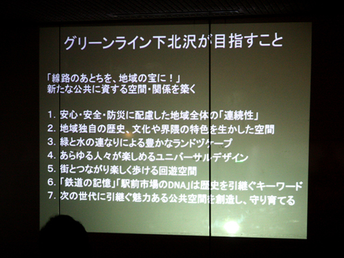 会場には、小田急線跡地の利用に高い関心を寄せる周辺住民の人たちを中心に約70名参加。会の後半には公務の合間を縫って世田谷の保坂展人区長が駆けつけるなど、この事業に対する関心の高さと熱意を伺わせた。その後、11月10日に開催された第2回のセミナーでは、都市交通の専門家中村文彦さん(横浜国立大学教授)と今は「グリーンライン下北沢」顧問の小林正美さん(明治大学教授)が、交通の観点から跡地利用を考える講演を行った。
