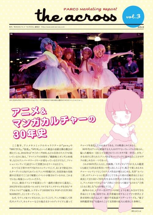ここ数年、アニメやコミックのキャラクターが、『pen』や『BRUTUS』『装苑』『SPUR』といった雑誌の表紙を飾る機会が増えている。2009年の「機動戦士ガンダム30周年」を皮切りに、2012年は「サイボーグ009」や「宇宙戦艦ヤマト2199」などの名作のリメイクが続いているのに加え、「タツノコプロ50周年」「マクロス30周年」などのアニバーサリーイヤーが重なっているだけでなく、ファッション系のコンテンツとも結びついて消費されるケースも目立つ。
