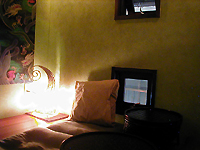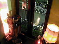 同店は、2階建ての店が並ぶなか、他店より頭1つ高い3層構造。戸を開けると目の前は靴箱を兼ねた階段になっており、1Fは全て厨房。2Fは無理矢理気味の2層になっており、下段には4名、上段には5〜6名分のスペースが設けられている。店内のインテリアは小ぶりだがディテールが凝ったアジアンアンティークでまとめられ、必要最小限の明るさの照明とあいまって落ちついた雰囲気を演出していた。店舗面積は1〜2F合わせて6坪ほど。キャパシティは約10名だそうだ。