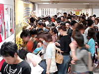 これは、今春に新発売したデジカメ「クールピクス」の宣伝の一環。ぶら下がっている商品の模型は、流行りのペールピンクにパールブルー、シルバーと商品同様3種類。メイド・イン・チャイナとはいえ、20以上もの行程を経て生成された模型は、遠目にはホンモノのように見えなくもない。思わず手を伸ばす人、人、人でポスターの前は大賑わい。しかも、ひとつひとつがマジックテープで貼付けてあるだけなので、ベリッ、バリッとあっという間に1つ残らず剥がされてしまった。